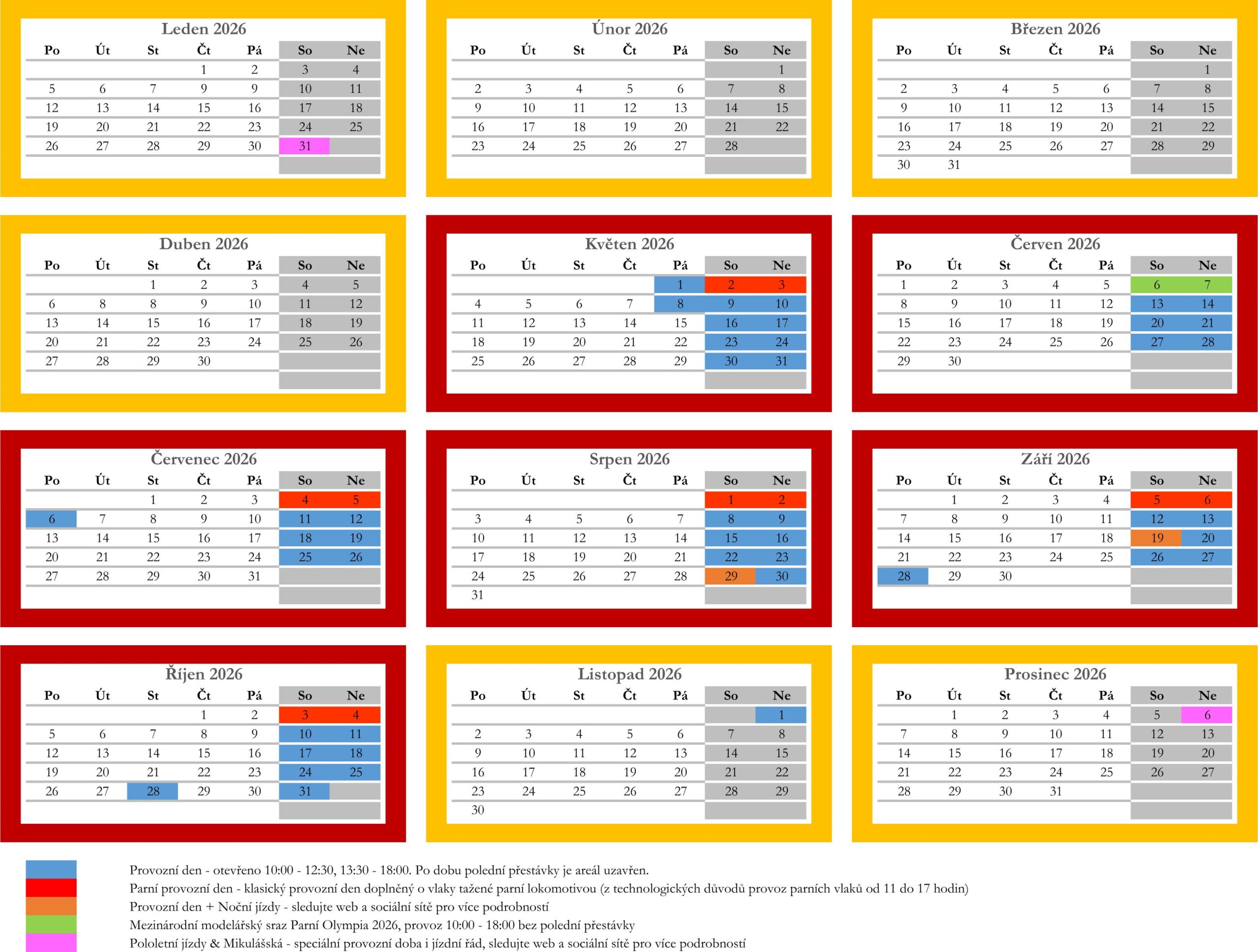 Všechny provozní dny parkové dráhy a další konané akce najdete v našem Kalendáři akcí níže. Jednotlivé druhy provozu jsou rozděleny barvami podle legendy níže.