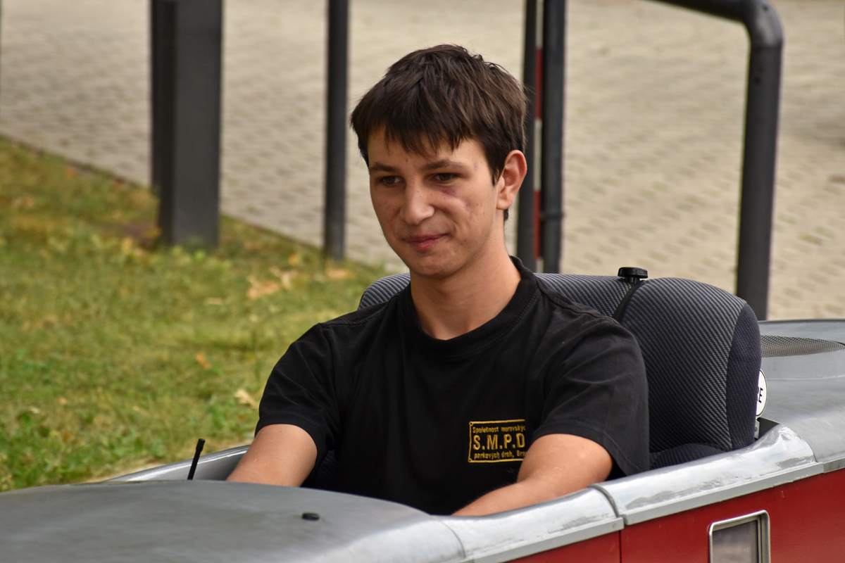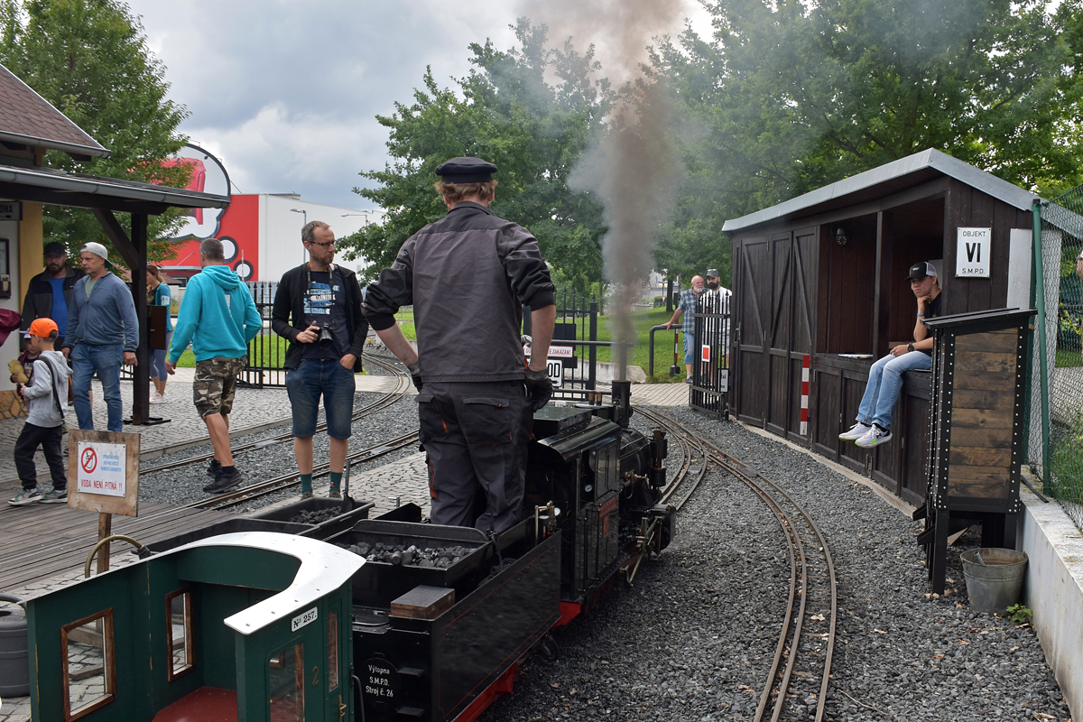 Štěpán má dnes velmi příjemně jednotvárný rozpis. Celý den jezdí s lokotraktorem ev.č. 12 a užívá si nově získané oprávnění na tento stroj. Podobně “easy job” má i Martin D., který celý den sedí v červeném TU a rovněž najezdí nějakých 40 kilometrů s cestujícími po naší dráze. Na druhém lokotraktoru se pak už prostřídají strojvedoucí tři – Tomáš J., Martin Š. a Kuba Š. Jinak je rozpis definovaný tím, že je nás ten den poměrně málo, a zajištěny jsou tak pouze běžné provozní funkce, které vyžaduje provoz pro cestující. Školit něco není ani moc koho, ani na co. Ale to nevadí, letos se daří rozšiřovat dovednosti členů víc než uspokojivým tempem, a není vůbec na škodu někdy jen “jezdit a neřešit”. Vzhledem ke konání tradičních brněnských oslav dopravní nostalgie, dni otevřených dveří v jedné z tramvajových vozoven, večernímu ohňostroji na přehradě a dalším akcím různě po Jihomoravském kraji i rodiny s dětmi tráví svůj volný čas převážně jinde a na nástupišti se netvoří žádné davy.