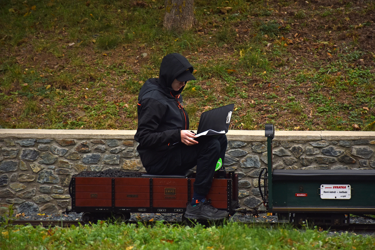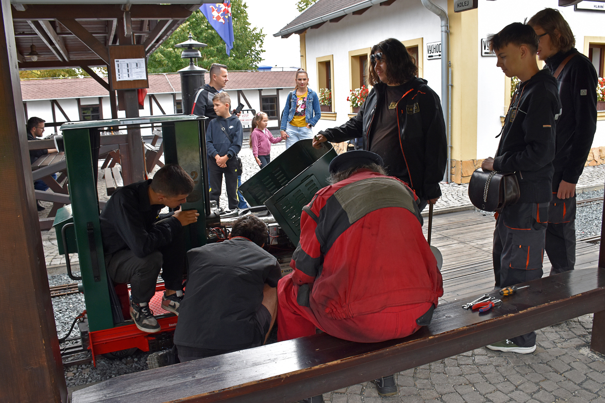 Odpoledne měl být Kuba v pokladně, kterou si za něj rozdělili Kuba Š. a Filip napůl, proti ježdění s lokotraktorem ev.č. 24. I s těžkou 4vozovou soupravou se dařilo teplotu hydrooleje udržet v rozumných mezích, což vykouzlilo úsměv na tváři obou strojvedoucích. Zbytek zásahů do rozpisu už byly drobnější změny – Tommy se srdnatě chopil funkce výpravčího, a Štěpán si o to déle zajezdil s TUčkem. Nikoho pochopitelně netěší, když kdokoliv z členů onemocní, ale schopnost si operativně přerozdělit směny a zajistit všechno potřebné posiluje týmového ducha.