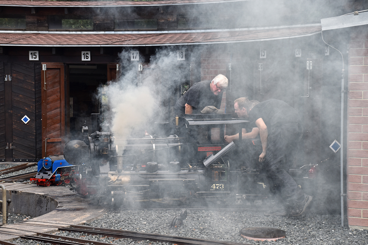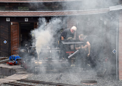 I neděle parního víkendu byla využita k zácvikům strojvedoucích. Kuba si tentokrát dopoledne roztopil Skalici našeho člena ze Strážnice, a byť se napřed tvářil, že oproti obřímu Mecklenburgu, za který většinou usedá o parních dnech, je to “takové nějaké no já nevím”, nakonec byl ze zpestření programu nadšený, a může tak samostatně obsluhovat další stroj. Bonifác pokračoval v zácviku na bateriové AEG, spíš než jízda samotná mu momentálně dělají problém předpisy. Matěj pak celý den obětavě zasvěcoval Staňu do provedených úprav na jeho parním “Účku”, aby měl i pro svůj stroj záložního fíru. Vlaky s nejhezčími vozy, vedené odpoledne ze 14. koleje na odstavném nádraží, zajistili Dan s Kubou. Tato úprava jízdního řádu se velmi osvědčila, jelikož 2. i 3. kolej velkého nástupiště, s přístupem k uhlí a vodě, mohla zůstat k dispozici parním lokomotivám, a nevadilo tak, pokud se zrovna sjelo více parních vlaků dohromady, nebo se strojvedoucí některého z nich potřeboval delší chvíli věnovat průběžné údržbě, mazání stroje apod. Tim si vyzkoušel na 14. koleji službu pomocného výpravčího, zbytek týmu pak odvedl dobrou práci na všech dalších potřebných pozicích. Oběd hýřil barvami jako jarní louka – Filip připravil zapečené těstoviny, které v jeho provedení dělají čest svému názvu “pestrobarevné”.