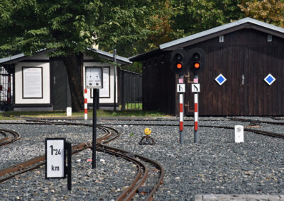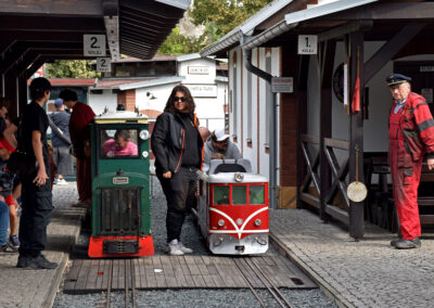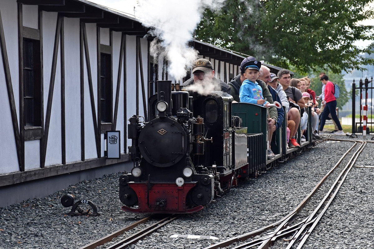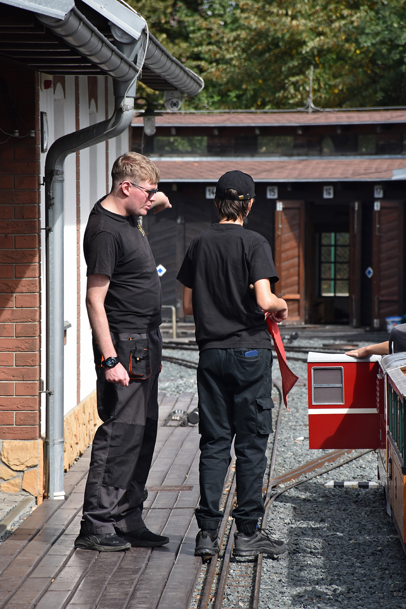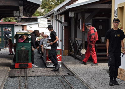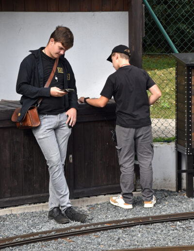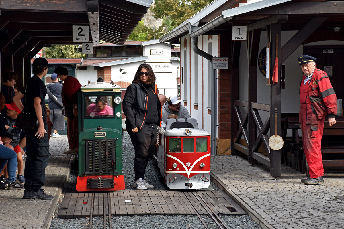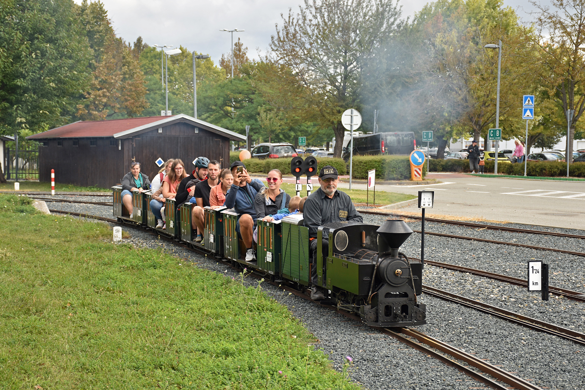 Od 21:30 nabízíme možnost cestujícím vystoupit v dopravně Amfiteátr, proto jsou naše vlaky doprovázeny vlakvedoucími. Stejně jako loni, ani letos si nikdo projížďku nechce zkrátit jen na „půlkolo“, přesto tuto vychytávku ale rádi zachováme pro další sezonu. S úbytkem slunečního svitu na sebe nenechává dlouho čekat přicházející ochlazení, a tak se po areálu začínají objevovat postavičky v našich klubových mikinách. Nutno říct, že zavedení jednotného stejnokroje opravdu pozvedlo úroveň personálu o další kousek výš. Ve 22:22 vyráží Tomáš H. na poslední odjezd s cestujícími, za ním pak už jen Jakub Šp., který provede závěrečnou kontrolu tratě, uzamkne výhybky do základních poloh a vypne přejezdy na trati. Vrchní posun ve večerních hodinách má pod palcem Viktor Č., krátce po 23:10 vyrážíme ku domovům. Ale nic se nebojte, zítra ráno jsme tu zase …