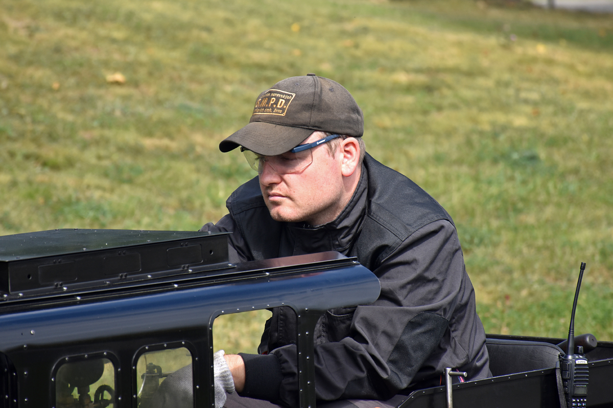 Odpoledne se řady přítomných členů rozšíří – Honza S. usedá do kabiny lokotraktoru 24 pod dozorem Martina S. a Viktora Č., Dan L. si vyzkouší všechny varianty naší trati v lokomotivě TU pod dozorem Filipa, Viktor s Václavem se budou starat o střih keřů a Výpravčího se zhostí letošní nováček Tomáš H.
