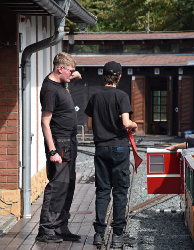 Ráno začalo školením Martina na funkci směnového výpravčího. V tomto případě se nejedná o toho výpravčího, který vypravuje vlaky. Jeho funkce je ale také nezanedbatelná. ‘’Směňák’’ připravuje všem strojvedoucím desky s jízdními řády, chystá vlakům pořadová čísla a také pro lepší komunikaci nachystá všem radiostanice. Během dopoledne zacvičoval Tomáš dva letos nově přijaté členy – Viktora a Štěpána. V úvodním školení, které zabere několik dní, je potřeba novým kolegům vysvětlit, na jakém principu naše dráha funguje, co je zde za funkce, nebo např. jak svěšovat vozy. Jak se jmenuje která budova, co kde najdeme, jaké u nás platí předpisy a zákonitosti, jaké jsou odpovědi na běžné dotazy cestujících, co se “smí a nesmí” a mnoho dalšího. Během odpoledne kluci některé nově nabyté informace zužitkovali na směnách průvodčí a občerstvení, na kterých se vzájemně vystřídali.