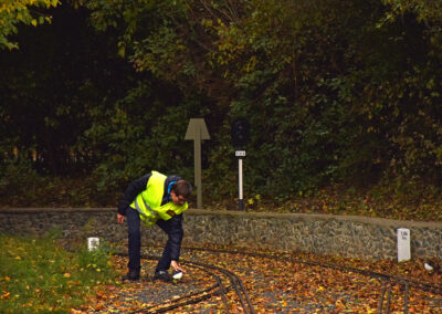 Práce na místě začaly už v sobotu, kdy Kuba a dva dobrovolníci přišli připravit základ našeho nedělního obědu a večeře – přeci jen nakrmit 35 hladových krků už vyžaduje drobnou logistiku. To hlavní se ale rozjíždí v neděli krátce po půl deváté ráno, kdy se po areálu Hlavního nádraží začínají hemžit naši členové ve stejnokrojových bundách a pomalu se ujímají svých, Hlavním výpravčím, předem stanovených funkcí a úkolů. Filip s pracovní četou vyrazí na průjezd tratě, kde je po měsíci absence provozu překvapí napadané listí, nahromaděné bahno, a další nepříjemnosti, které mají na sjízdnost naší tratě negativní vliv. Pavel a Viktor P. zase domlouvají navátému listí v oblasti Hlavního nádraží, jiní pomáhají s rozhýbáním nepoužíváním zatuhlých výhybek. Poté už se i hrnou lokomotivy z depa do vozovny a pod taktovkou posunovače Stani se začínají tvořit soupravy. Díky počasí, které nám letos nedopřálo sněhovou pokrývku, máme přípravu tratě hotovou v rekordním čase, a tak se před obědem ještě věnujeme prohlubování mezičlenských vztahů, například hraním stolních her, nadšenci do hromadné dopravy si pak vyměňují poznatky ze svých výletů, které obohacují i o fotodokumentace. Pak náš návěstní zvon udeří 8x – je tedy čas zasednout k obědu – Svíčkové na smetaně s knedlíkem.