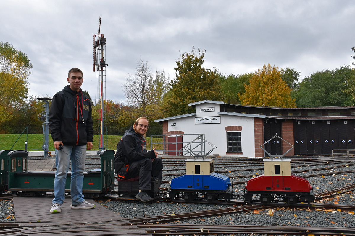 Avšak máme i mnoho členů s jinými jmény, bez kterých by se provoz na parkové dráze neobešel. Například strojvedoucí Dan na druhé lokomotivě TU si provozní závady vybral nejméně na celou sezónu dopředu, ať už se jednalo o poruchy lokomotiv, závady na zabezpečovacím zařízení, nebo závady na vozech. Naštěstí nic z toho nemělo vliv na ostatní vlaky, závady se vyřešily v následujících několika minutách od jejich vzniku, a Dan to bravurně se stejnou lokomotivou dotáhnul až do konce. Hlavními aktéry v provozních závadách byly lokomotivy č. 4 a 6, které již opět mají slabé baterie, a tak jejich dojezd se je spíše náhodný. Jediné, co se dá určit je, že celý den rozhodně jezdit nevydrží. Uvidíme, kdy se k nim přidá i lokomotiva č. 9, která byla více šetřena na zálohách, avšak má i jiný typ baterie. Červená lokomotiva č. 6 to dnes vzdala po několika dopoledních kolech, zatímco její modrá sestra č. 4 vydržela pod vedením Marka v zácviku a instruktora Kuby celé odpoledne. Lehkým povzbuzením v závadách může být, že za dopoledne se podařilo utěsnit okno v lokotraktoru 12, a tedy pokud zaprší, tak by se již na ovládacím pultu neměl objevit potůček vody směřující k podlaze lokotraktoru. Nadto se čelní sklo i přestalo ze nepříjemného kustického doprovodu chvět. V celkovém měřítku se jednalo o úspěšný den plný zábavy – a svezených cestujících. A proto tam jsme 🙂