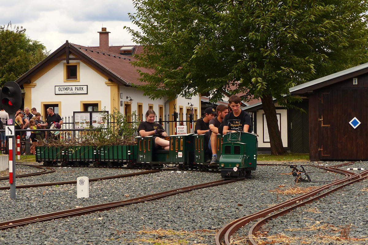 Čtvrtá červnová neděle ještě počasím ne úplně připomíná horké letní dny, letošní nástup parného léta je poněkud opožděnější. To ale nic nemění na tom, že sluníčko už je vidět na obloze více, než polovinu dne, a kdo má predispozice se opalovat, nesmí zapomenout na opalovací krém. Počasí také nahrává růstu keřů v okolí naší tratě. O sekání trávy se stará správce parku Olympia. Ale střih keřů si zajišťujeme sami tak, aby nám nezasahovaly do průjezdného průřezu našich vlaků.